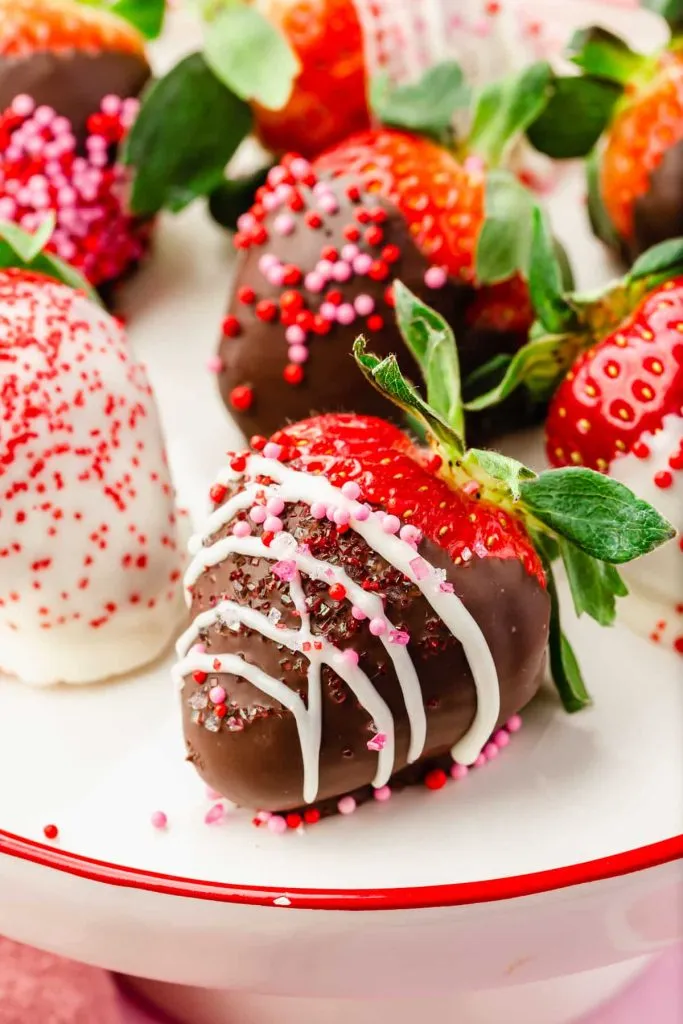 Step 3: Dip strawberries one at a time and immediately roll them in rainbow sprinkles or red sprinkles. You can use a shallow bowl of sprinkles and literally roll the strawberry around, or hold it over a plate and use a spoon to sprinkle them on top. The more sprinkles, the better. Don’t be shy. These should be fun and colorful and happy.